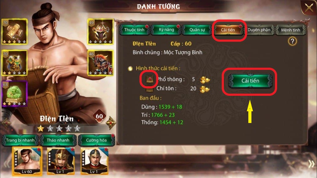 Thành Chủ hãy chọn vào giao diện thông tin tướng, chọn tab cải tiến để đến giao diện cải tiến tướng