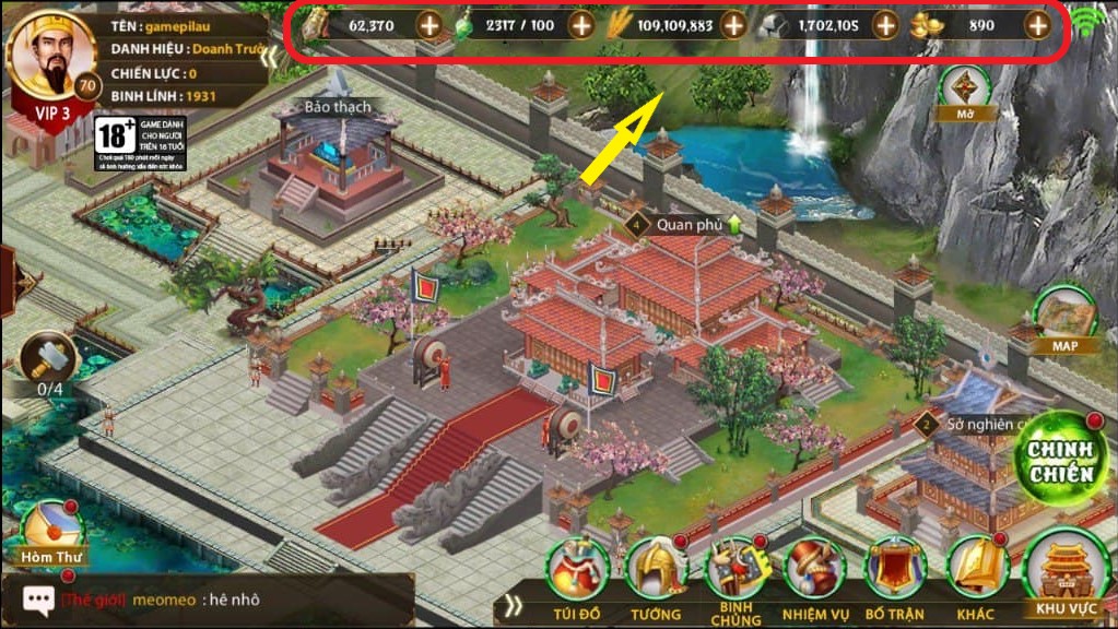 Danh sách các tài nguyên chính trong Thành Chiến Mobile bao gồm: Bạc, Lúa, Chiến Tích, Tinh Thạch, ...