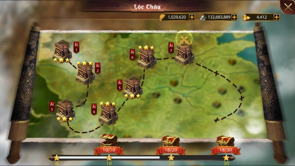 Nhấn vào chinh phạt sẽ dẫn ra ngoài map khu vực, người chơi chọn thành muốn tấn công, chọn vào tấn công để vào giao chiến.