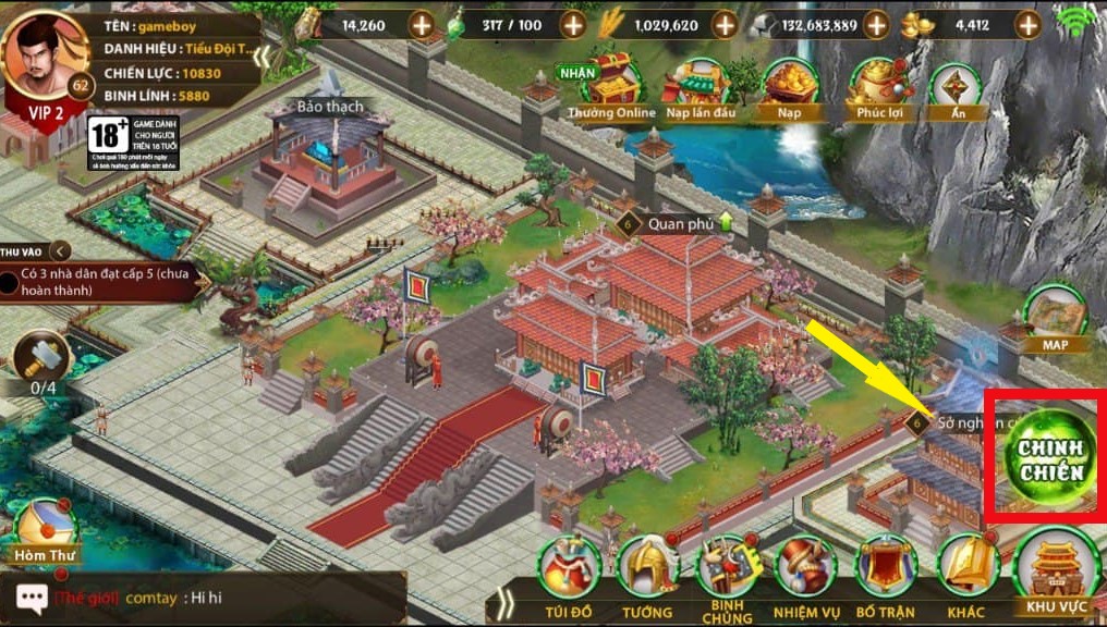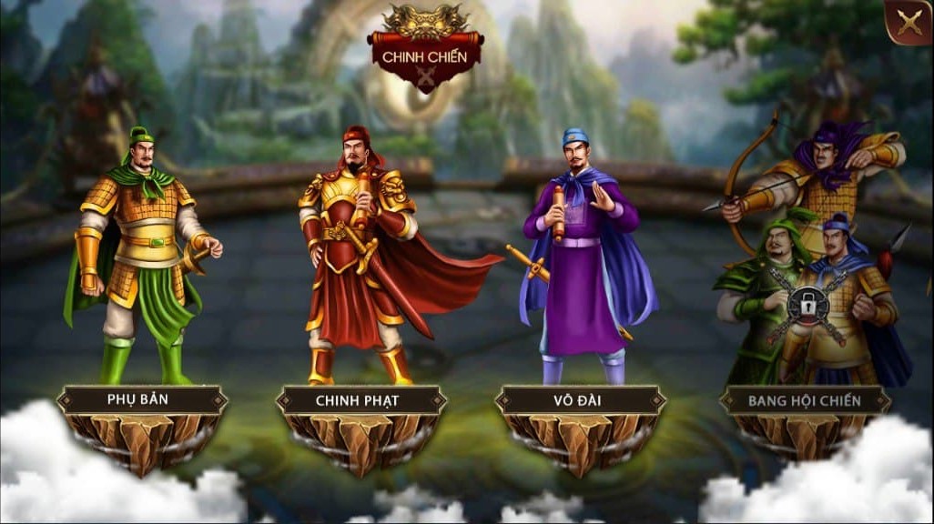 Người chơi click vào biểu tượng Chinh chiến, hiển thị lên giao diện chinh chiến bao gồm các tính năng: Phụ bản, Chinh phạt, Võ đài, Bang hội chiến, Boss, Lôi đài.