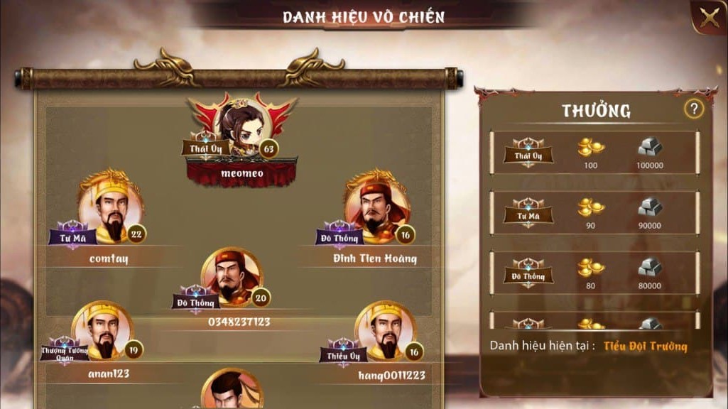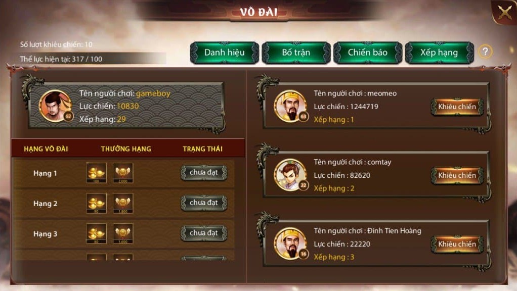 - Theo xếp hạng, người chơi sẽ nhận được danh hiệu võ chiến tương ứng và nhận thưởng bống lộc hàng ngày trong hòm thư hệ thống.