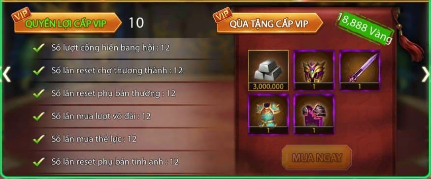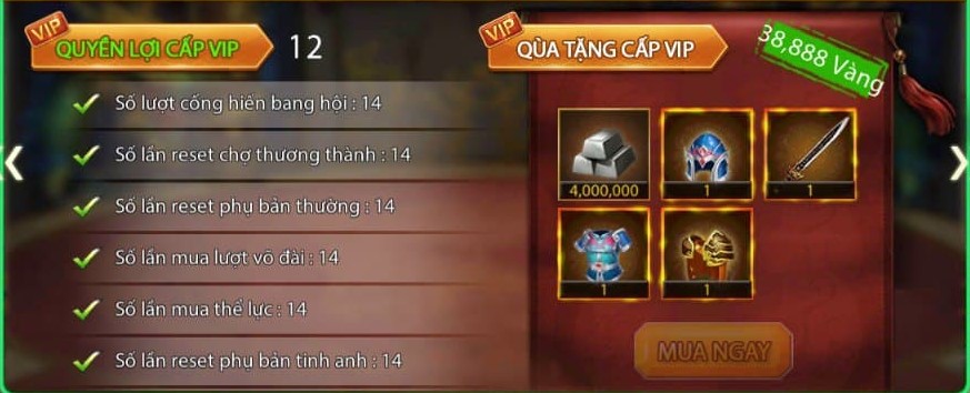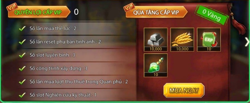 Khi Chúa Công tích nạp đủ mốc Vàng nhất định sẽ được tăng cấp VIP tương ứng kèm theo nhiều quyền lợi hấp dẫn dưới đây.