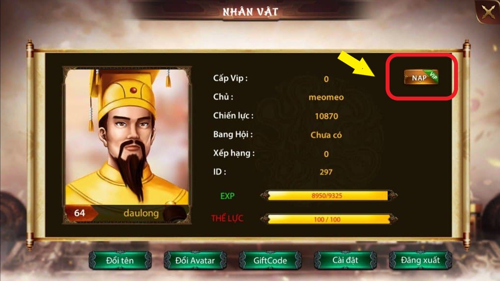 Để xem các quyền lợi VIP trong game chien thuat Kỷ Nguyên Thành Chiến, Chúa Công vui lòng nhấp vào biểu tượng Avatar bên góc trái màn hình hiển thị ra dialog Thông tin nhân vật, nhấp vào biểu tượng "Nạp" ở góc phải để đến giao diện xem thông tin cấp Vip.
