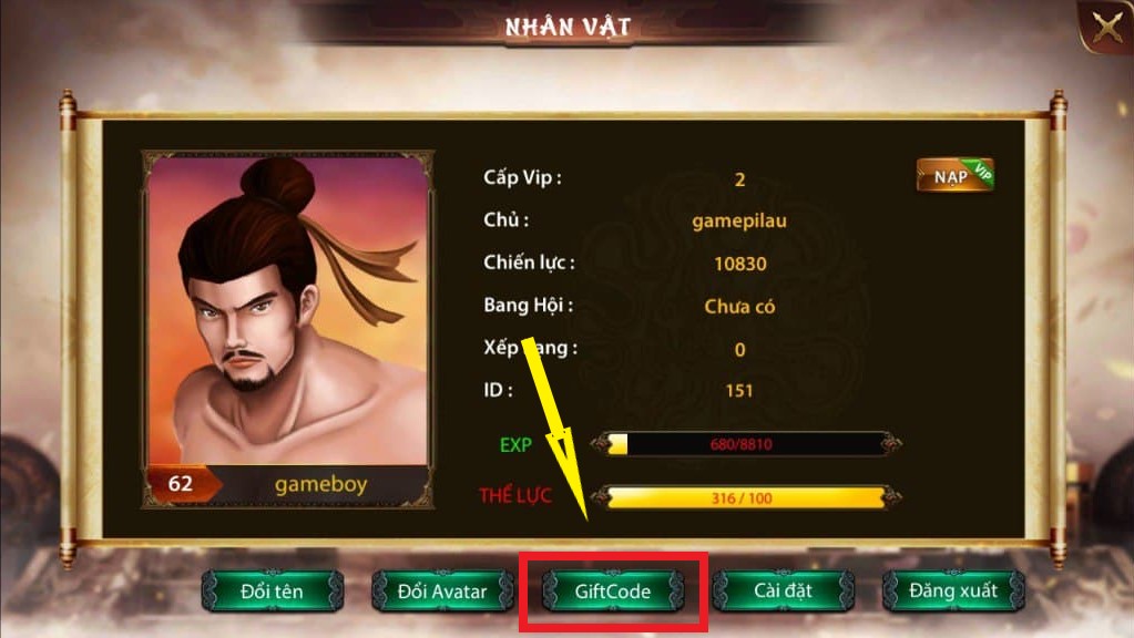 Bước 1: Người chơi click vào hình Avatar ở góc bên phải màn hình, sau đó người chơi click vào ô GiftCode.
