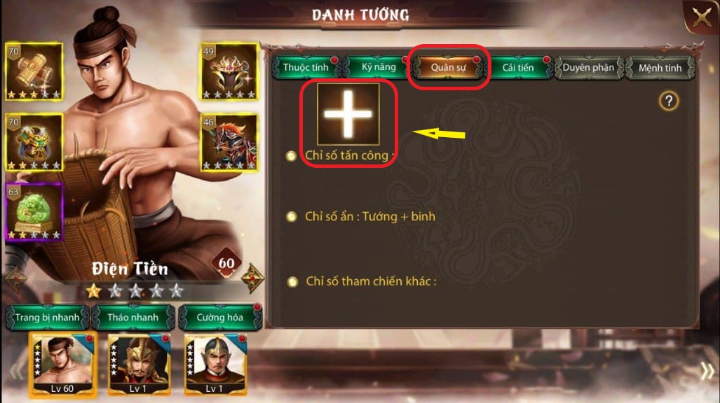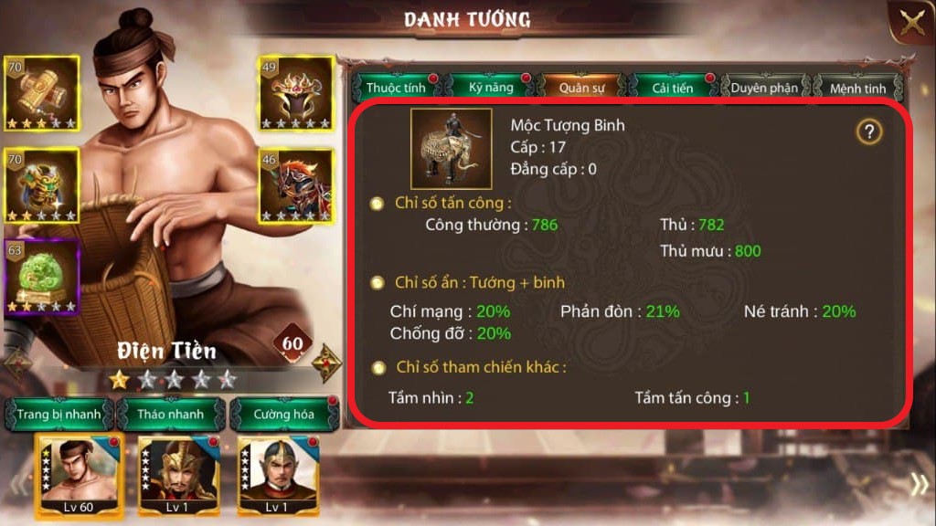 Sau khi trang bị binh chủng thì các thông tin chỉ số của tướng và binh chủng sẽ được cập nhật và hiển thị trong giao diện Quân sự.