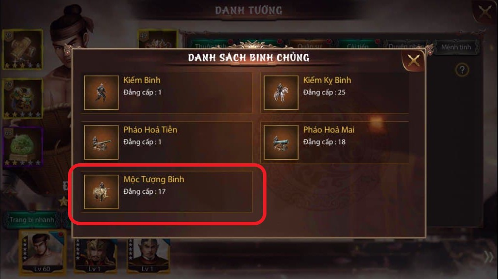 Nhấp chọn vào ô dấu cộng để hiển thị danh sách các binh chủng muốn ra trận cùng tướng, chọn 1 trong các binh chủng.