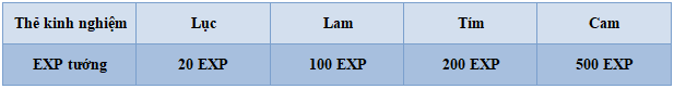 Có 4 loại thẻ kinh nghiệm: lục, lam, tím, cam.
