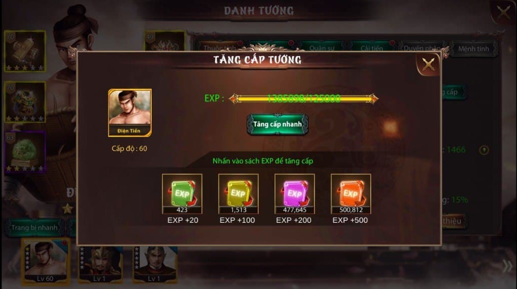 Nhấn tăng cấp nhanh sẽ sử dụng tất cả thẻ kinh nghiệm đang có, tăng nhanh exp của tướng trong 1 lần nhấp.