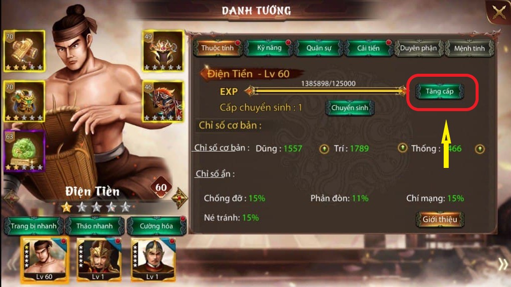 Trong giao diện Thông tin tướng, chọn vào "Tăng cấp"