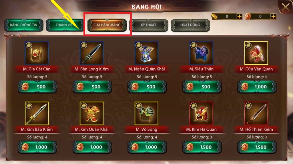 - Là nơi bán các vật phẩm có giá trị, người chơi trong Bang có thể sử dụng điểm cống hiến để đổi các món đồ trong Shop. Và trong ngày sẽ giới hạn số lượng vật phẩm người chơi có thể đổi được và sẽ được làm mới vào ngày tiếp theo.