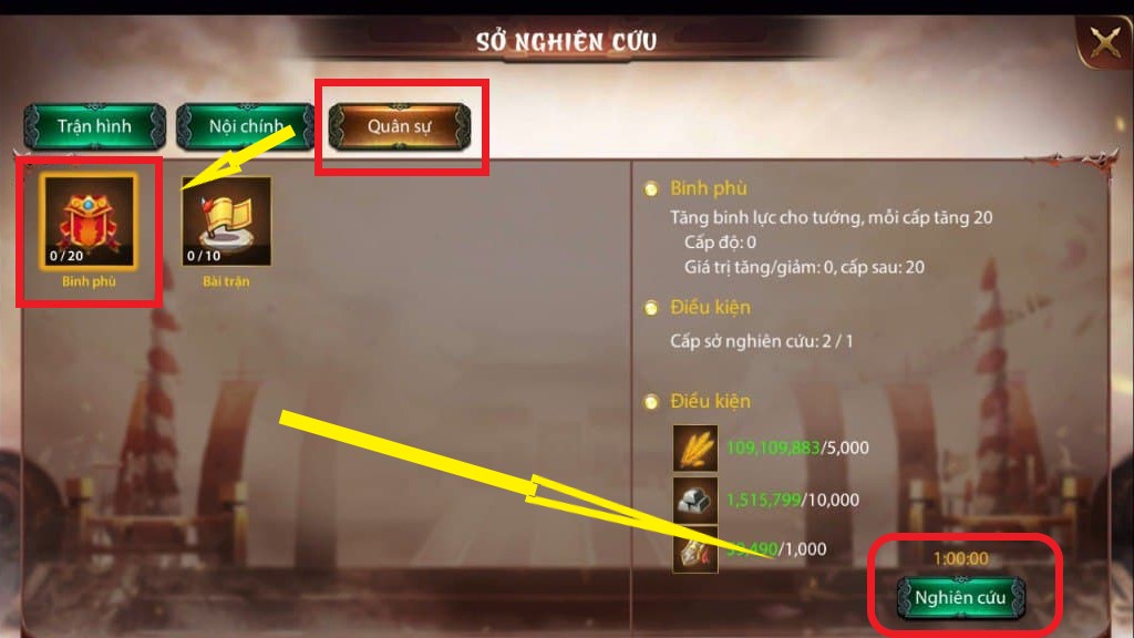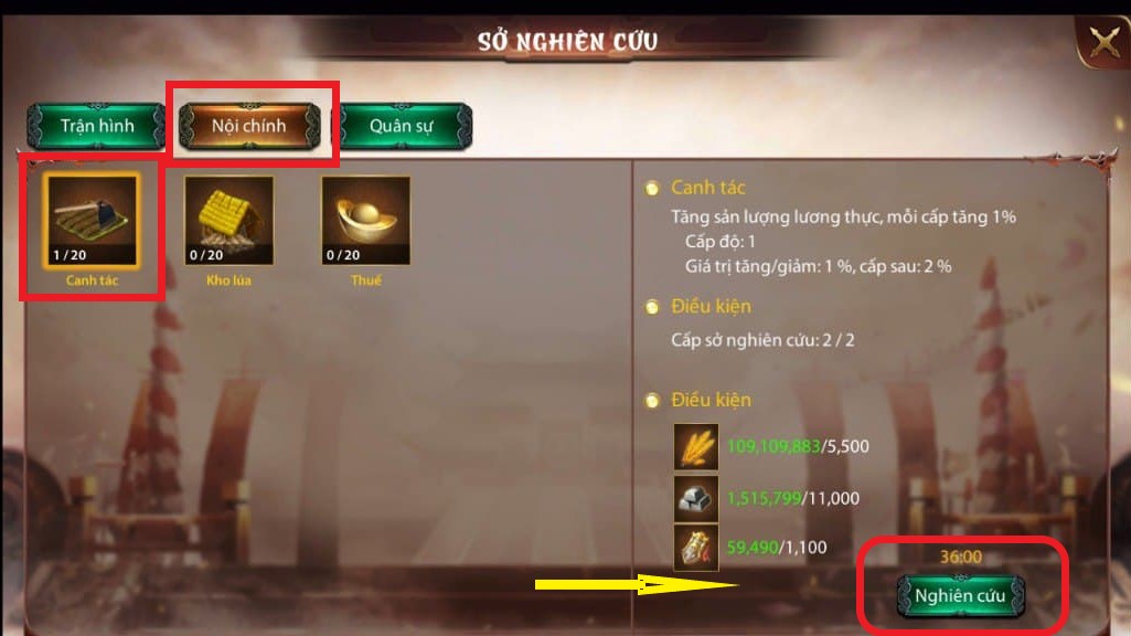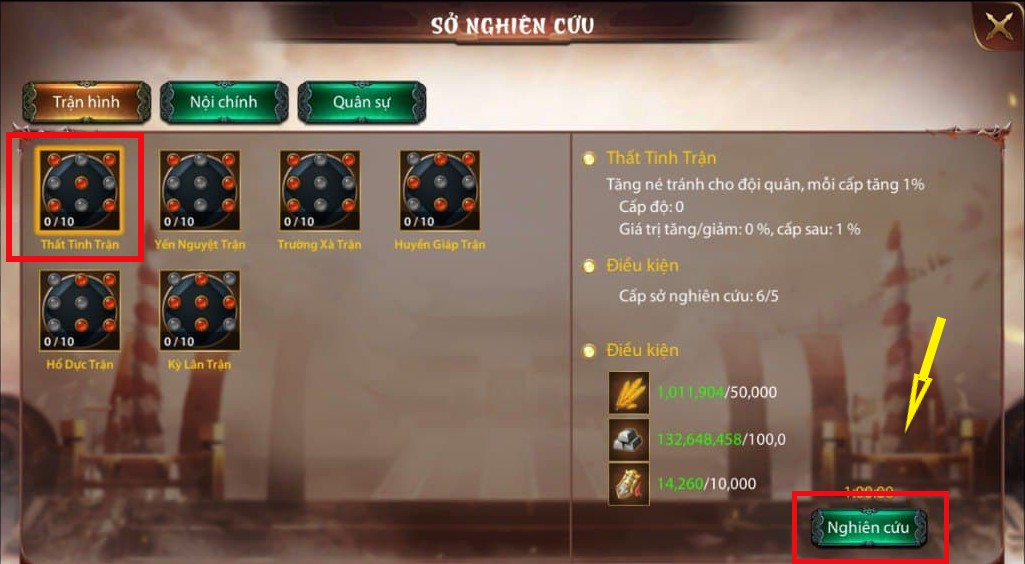 Nâng cấp kỹ thuật trong Sở nghiên cứu giúp gia tăng các chỉ số cho tướng, binh chủng và tài nguyên trong game.
