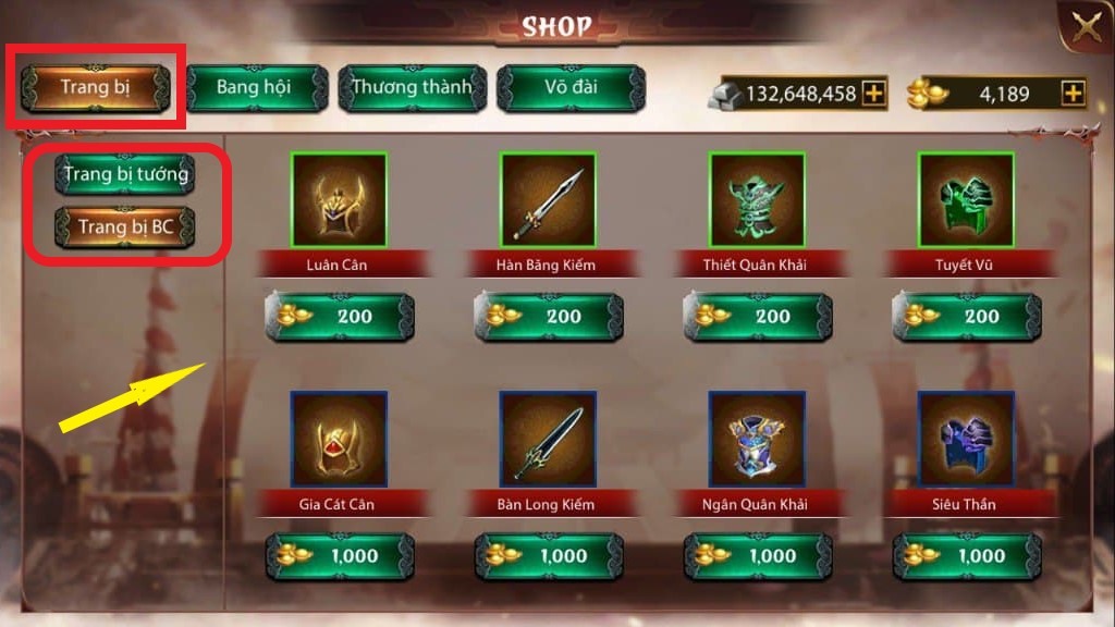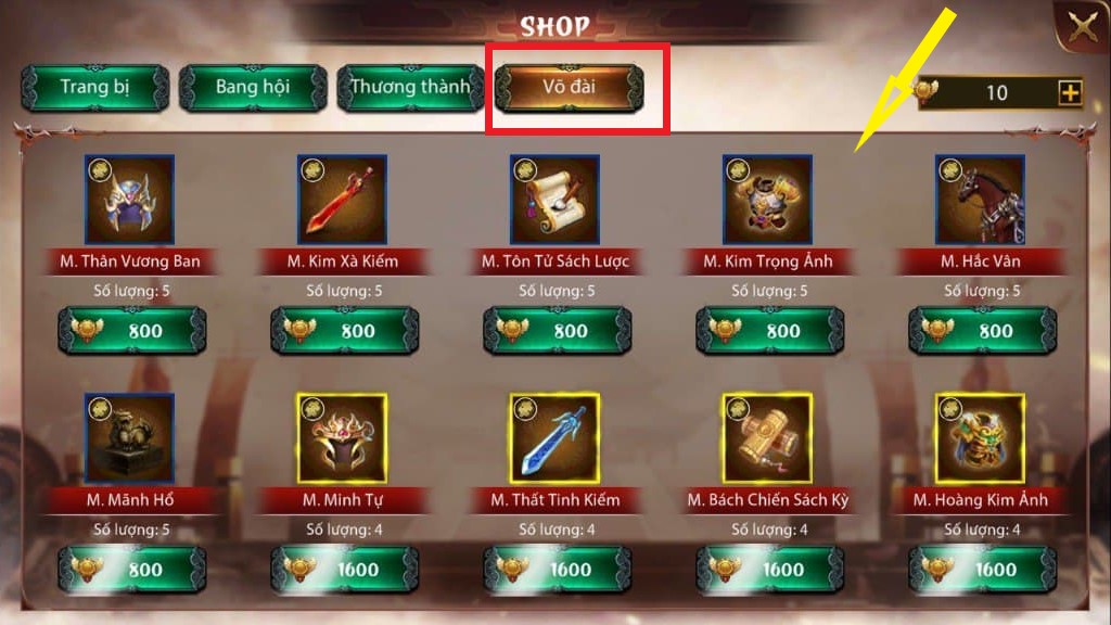 - Shop võ đài dùng điểm chiến huân để đổi mảnh trang bị tướng.