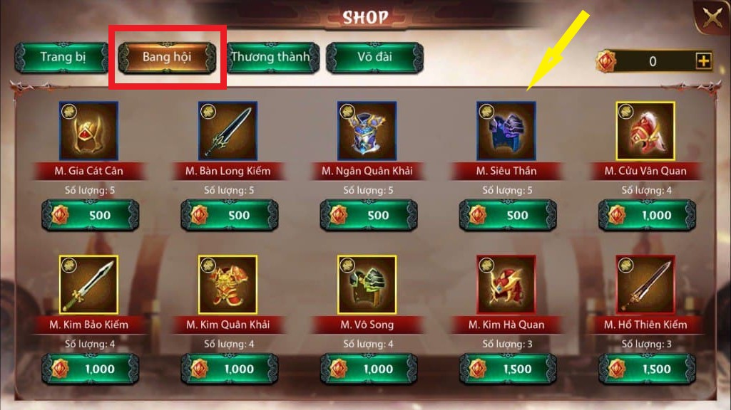 - Shop bang hội: dùng điểm cống hiến trong Bang hội để đổi mảnh trang bị binh chủng.