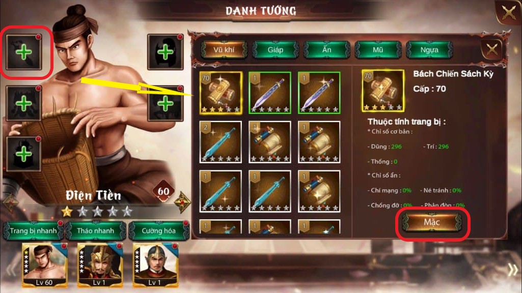 + Vũ khí: gia tăng chỉ số dũng và chí mạng cho tướng khi trang bị