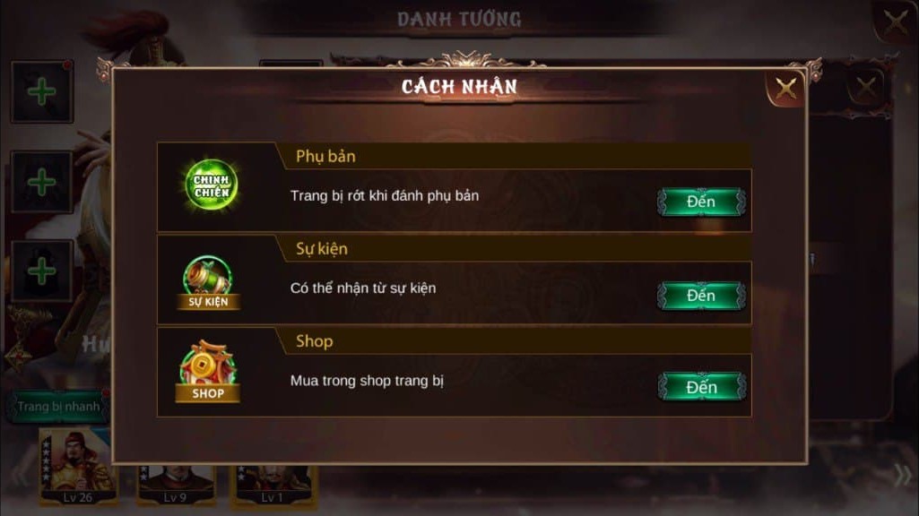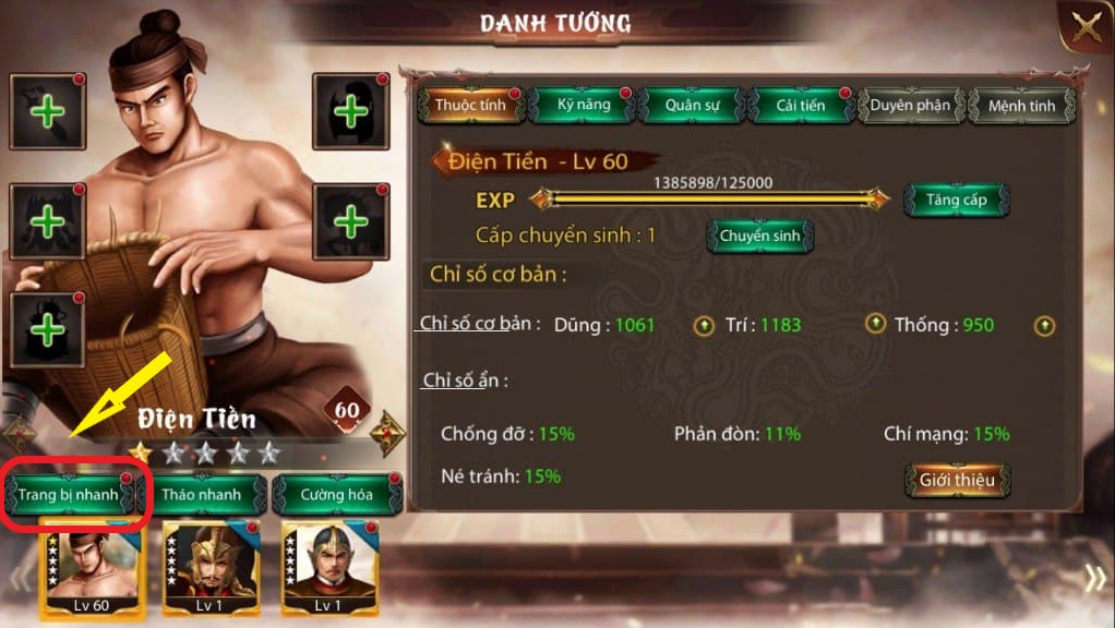 Chúa công có thể thực hiện trang bị nhanh hoặc vào từng trang bị để mặc cho tướng.