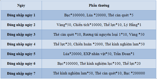 - Người chơi đăng nhập ngày nào thì nhận quà ngày đó