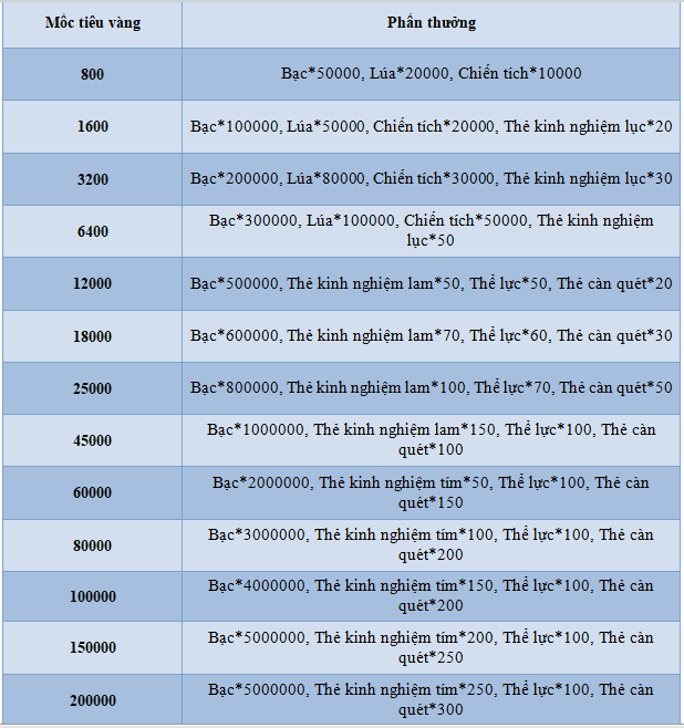 Nội dung: Khi người chơi tiêu tiền đến mỗi mốc nhất định sẽ được quà tặng ingame tương ứng, vàng tiêu được tích lũy từ mốc này lên mốc tiếp theo và tích trong thời gian diễn ra sự kiện.