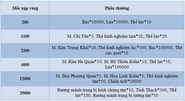 + Nạp đúng mốc mới nhận được quà, nạp cao hơn hoặc thấp hơn đều không nhận được (nạp 200 nhận quà mốc 200, nếu nạp 150 hoặc 300 thì sẽ không nhận được quà).