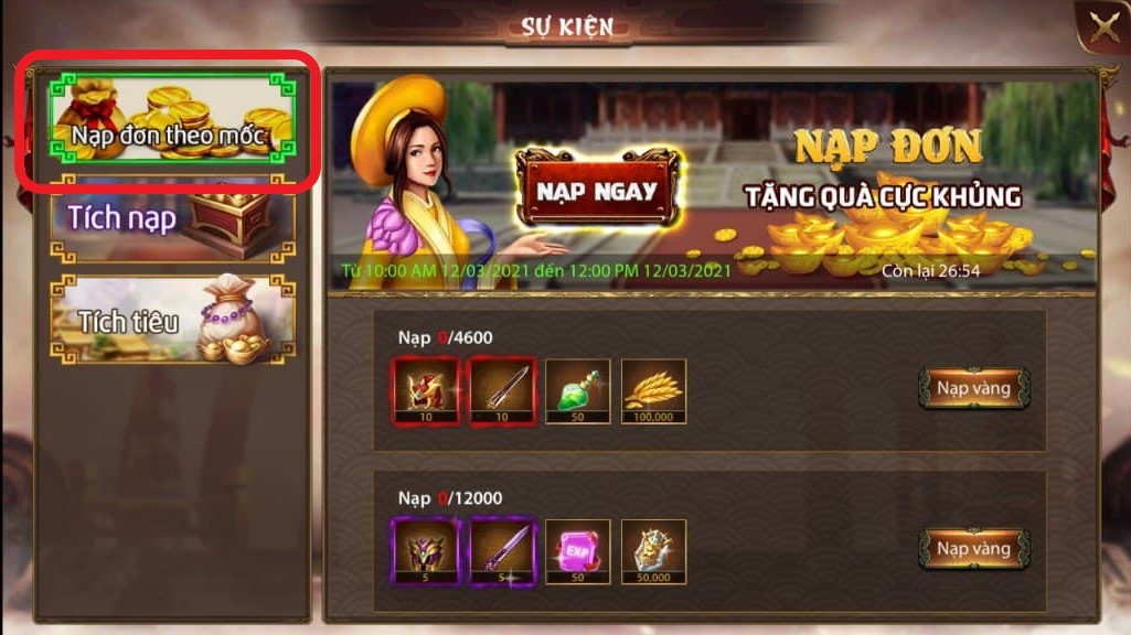 Nội dung: Nạp vàng theo mốc nhận quà tương ứng