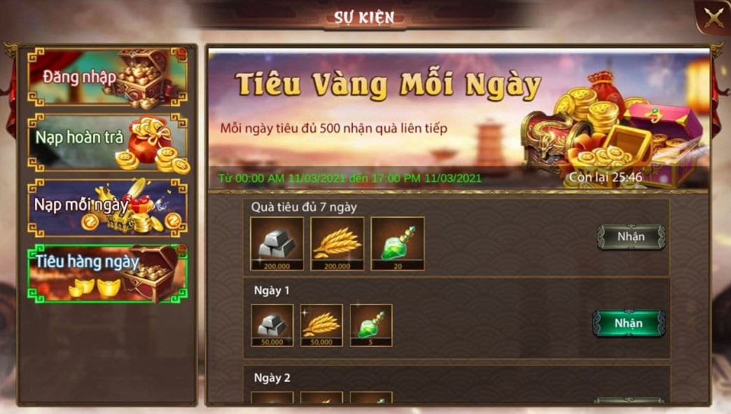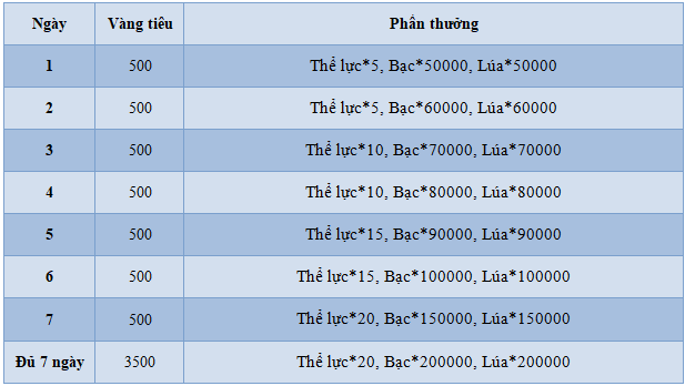 + Người chơi tiêu đủ vàng liên tiếp trong 7 ngày thì sẽ nhận đc quà mỗi ngày và nhận thêm phần thưởng lớn cuối cùng.