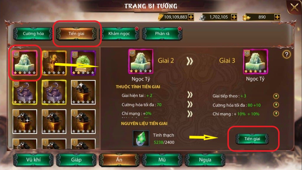 * Giao diện tiến giai trang bị tướng